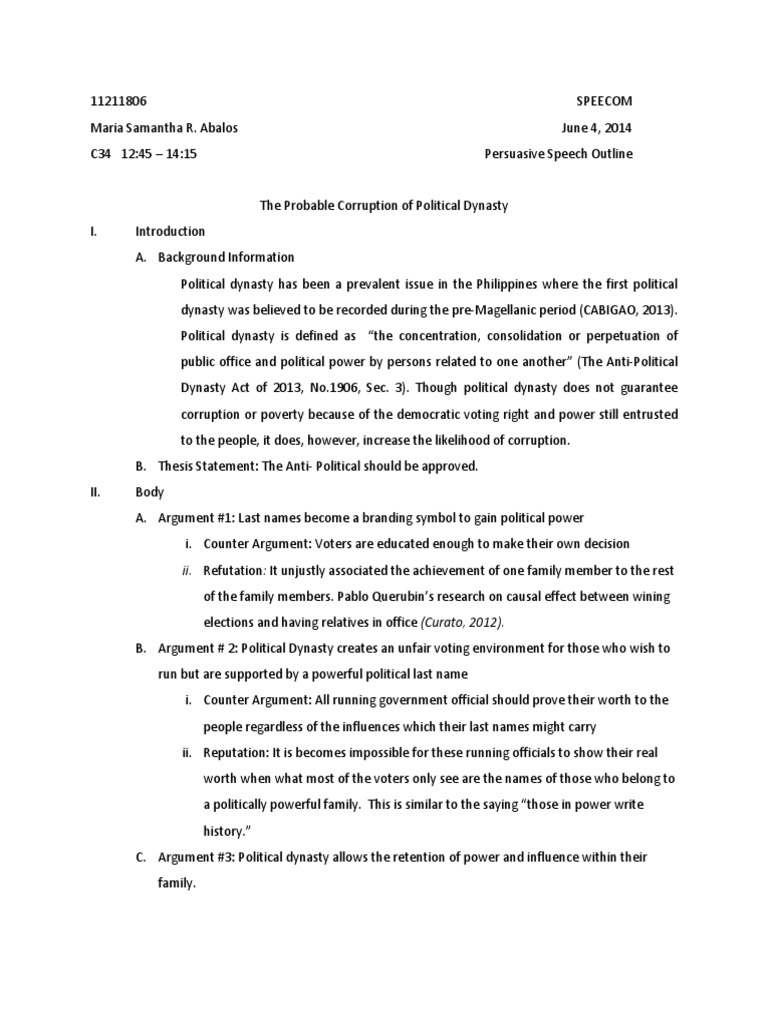 Endaya Speaker 1 Political dynasty is the concentration, argumentative essay about political dynasty, consolidation or continuation of public office and political power by persons related to each other. As the first speaker of the affirmative side, let me tell you why there is a necessity for anti-political dynasty law.