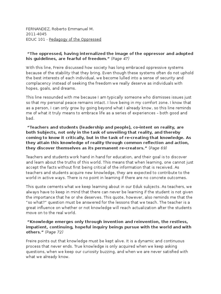 Related Papers. English: Language of hope or broken dream? By Caroline Kerfoot. Models of Adult Learning. By David Barton. By shudufhadzo sikhauli. Educational Praxis of Freire. By Richard Van Heertum. By Hitesh Kawedia. Download file. Log In with Facebook Log In with Google Sign Up with Apple. Remember me on this computer, pedagogy of the oppressed reflection paper. Enter the email address you signed up with and we'll email you a reset link.